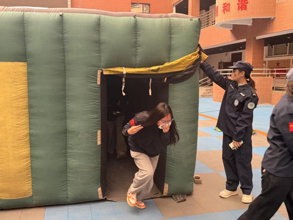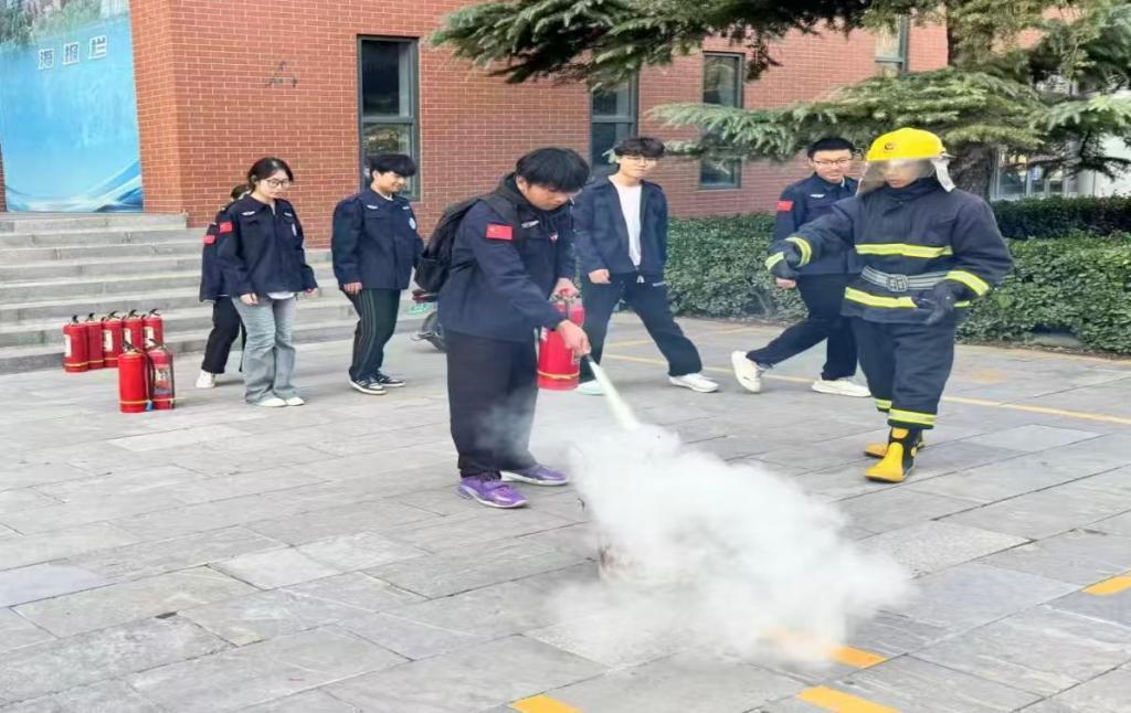在烟雾模拟逃生演练中,同学们严格遵循“低姿弯腰、湿毛巾捂口鼻、靠右有序前行”原则,快速响应、默契配合,顺利完成模拟火场疏散。灭火实战演练环节,学校消防社团成员化身“安全教官”,现场演示干粉灭火器“提、拔、握、压”四步操作法,手把手指导学生实操练习,让大家在亲身体验中掌握灭火技能。