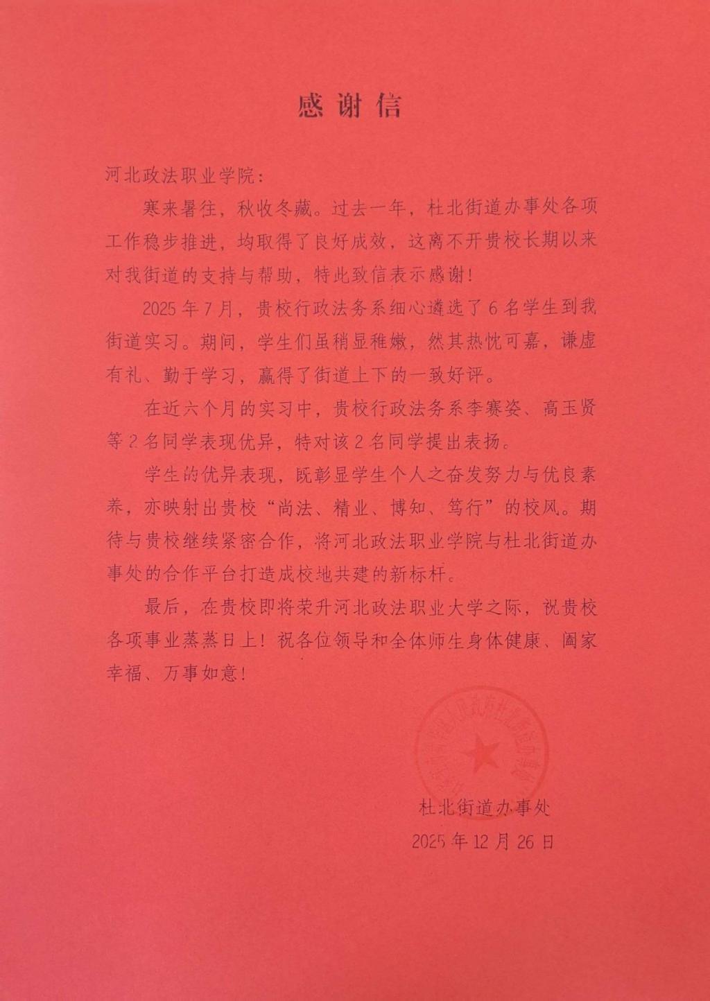 12月26日,新华区杜北街道办事处举行实习生欢送会,标志着行政法务系学生2025年为期6个月的整建制实习工作圆满收官。杜北街道办事处相关领导、行政法务系对接教师及全体实习师生参加了此次活动。